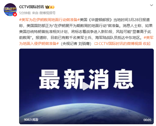 美国《华盛顿邮报》当地时间3月28日报道称,美国国防部正为“在伊朗展开为期数周的地面行动”做准备。消息人士称,如果美国总统特朗普批准相关计划,将标志着战争进入新阶段,风险可能“显著高于此前数周”。报道称,目前已有数千名美军士兵、海军陆战队员抵达中东地区。