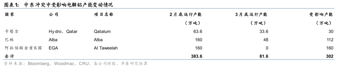近期中东局势持续升级,多家铝厂遭受直接冲击。根据WoodMac,阿联酋EGA旗下Al Taweelah铝厂遭伊朗导弹及无人机袭击,电力设施受损严重,电解槽被迫紧急停槽,已导致该产能处于停产状态,涉及总产能约160万吨/年;巴林铝业(Alba)此前因氧化铝短缺已宣布减产19%,3月28日铝厂再遭袭击后设施受到重大损毁,根据WoodMac预计,目前运行产能已降至约30%,涉及受影响产能约112万吨;卡塔尔铝业(Qatalum)因LNG断供目前运行产能约为正常水平的60%。本轮事件新增停减产产能约241.6万吨,叠加此前巴林铝业和卡塔尔铝业已公告的受影响产能,累计受扰动产能或超300万吨。