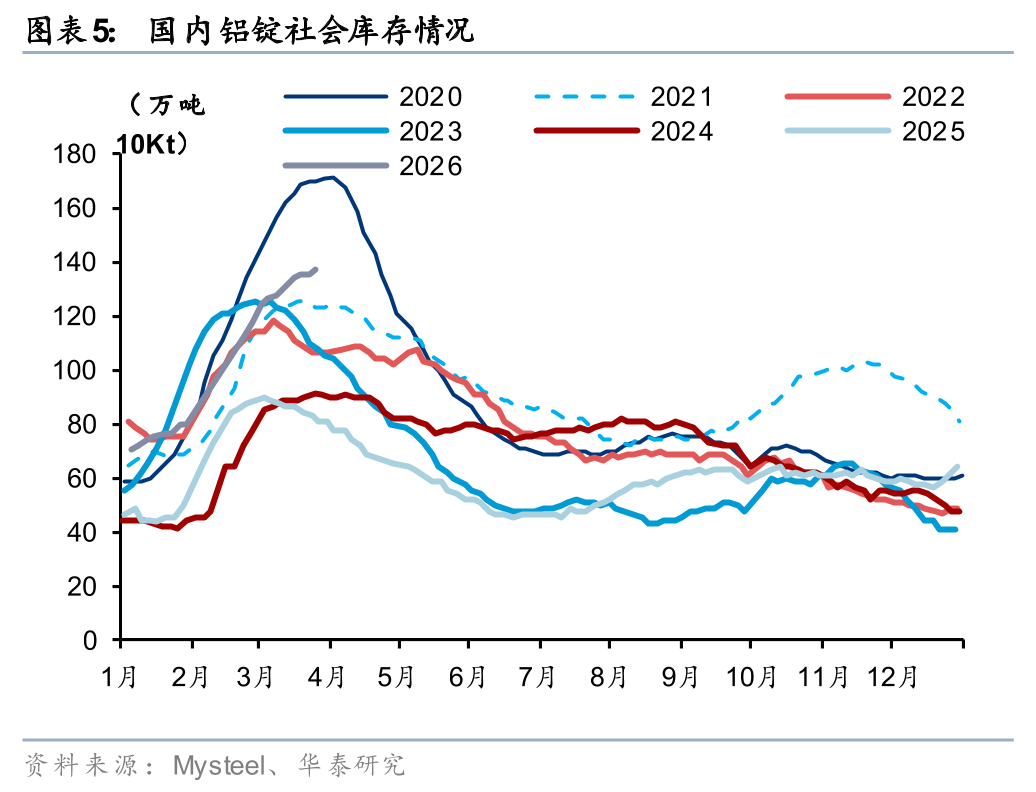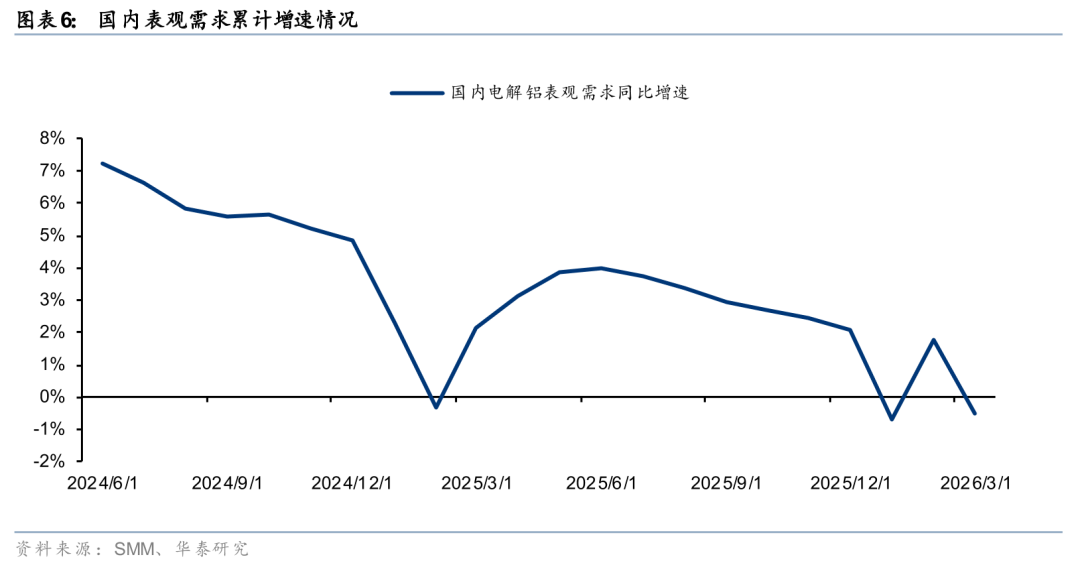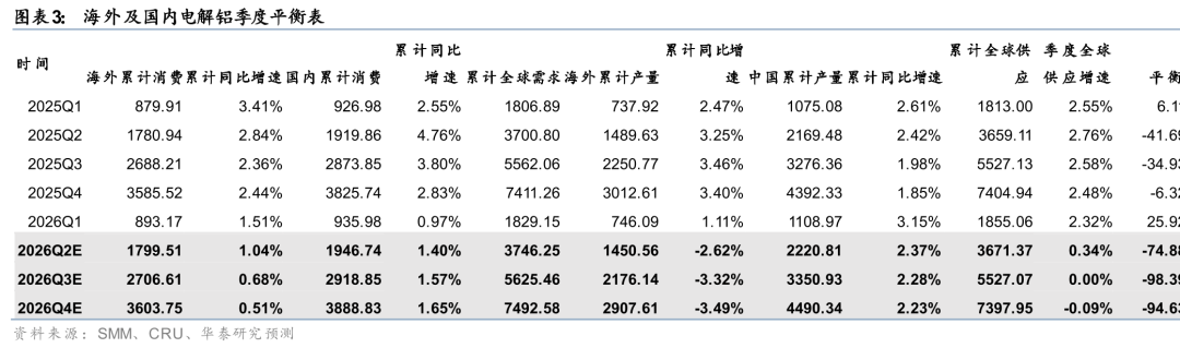 根据SMM数据,国内截至三月底的社会库存上行至137.3万吨,较去年同期增加57.3万吨,高库存对国内价格形成明显压制。国内库存持续上行主要系25年年底天山、扎铝等新增电解铝产能集中投产,导致国内运行产能从25年年底的4460.8万吨上行至26年一季度末的4510.8万吨,根据SMM统计数据,国内26Q1的电解铝累计产量增速达到3.2%。展望后市,无需对国内供应过度担忧,投产高峰过后,国内新增产量较少,26年的增量相比目前海外减产规模来看依旧偏小,预期全球供给26年或呈减量态势。